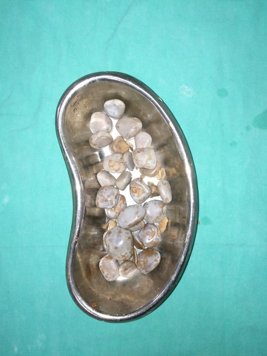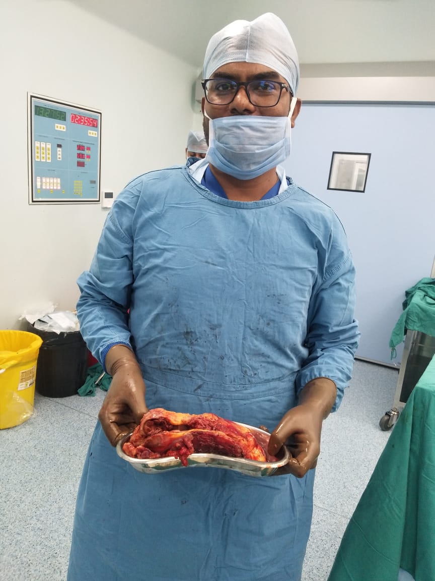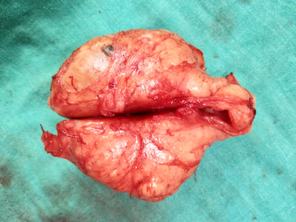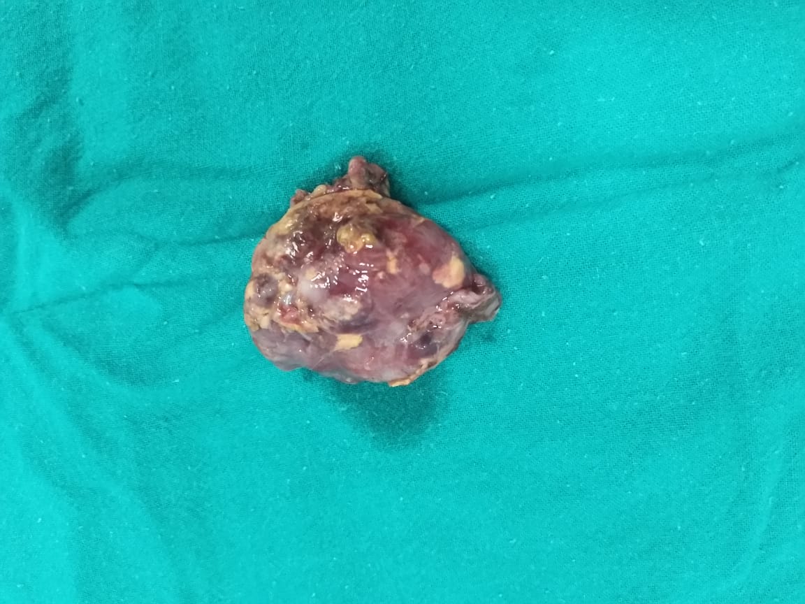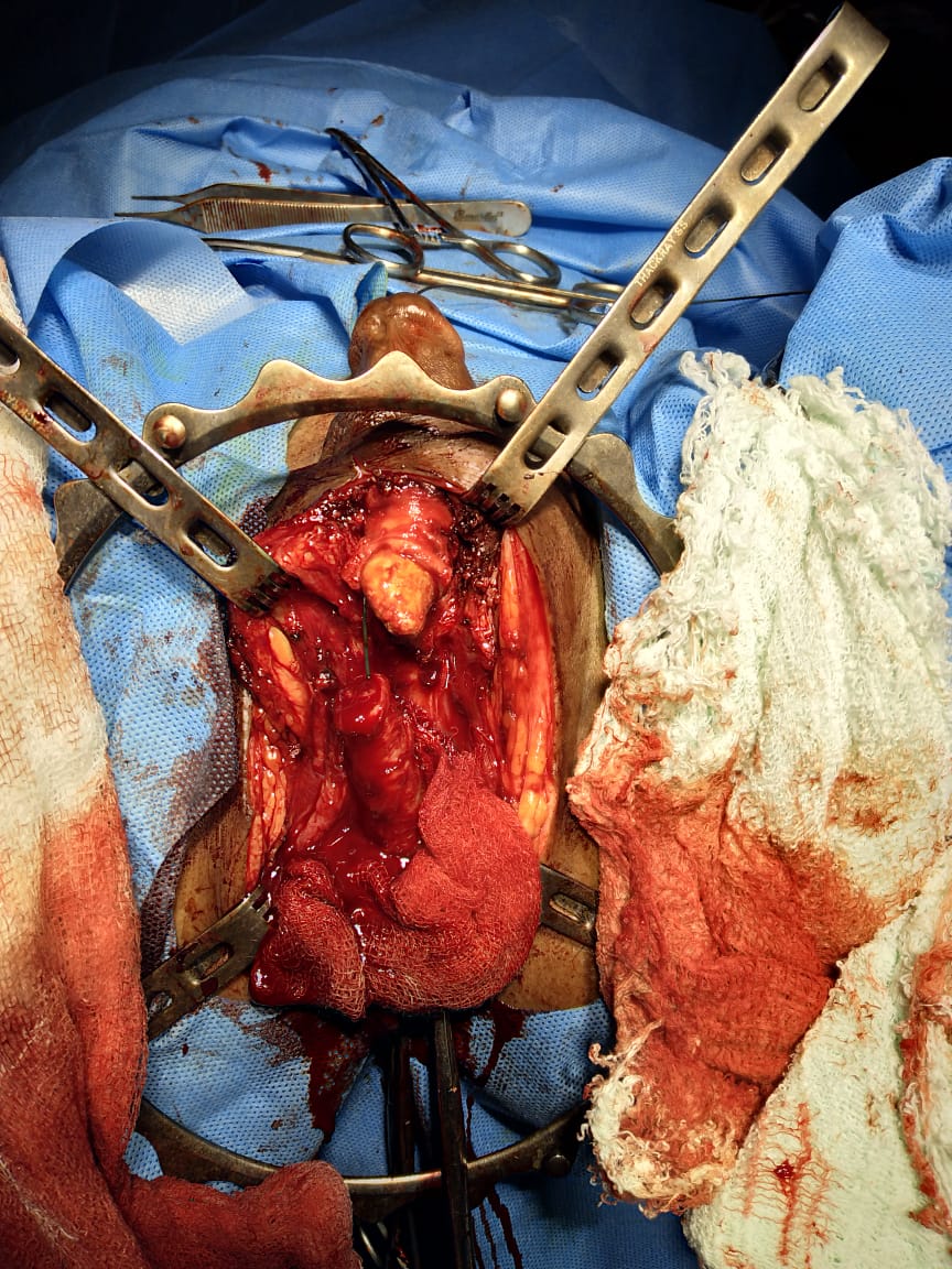 Open prostatectomy for huge prostate enlargement with urinary retention. Complete removal of prostate done with small skin incision