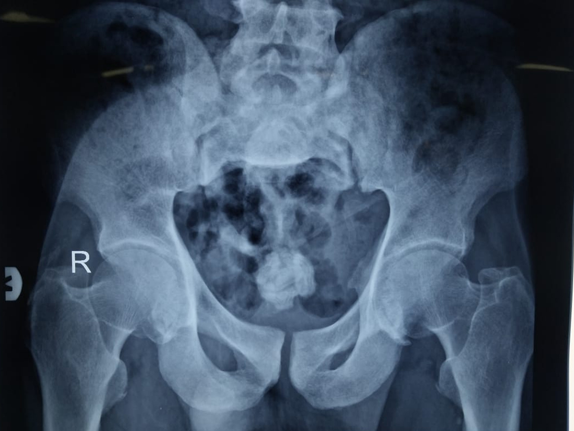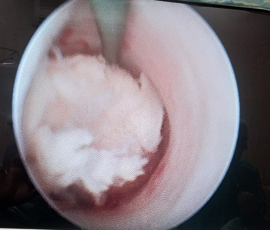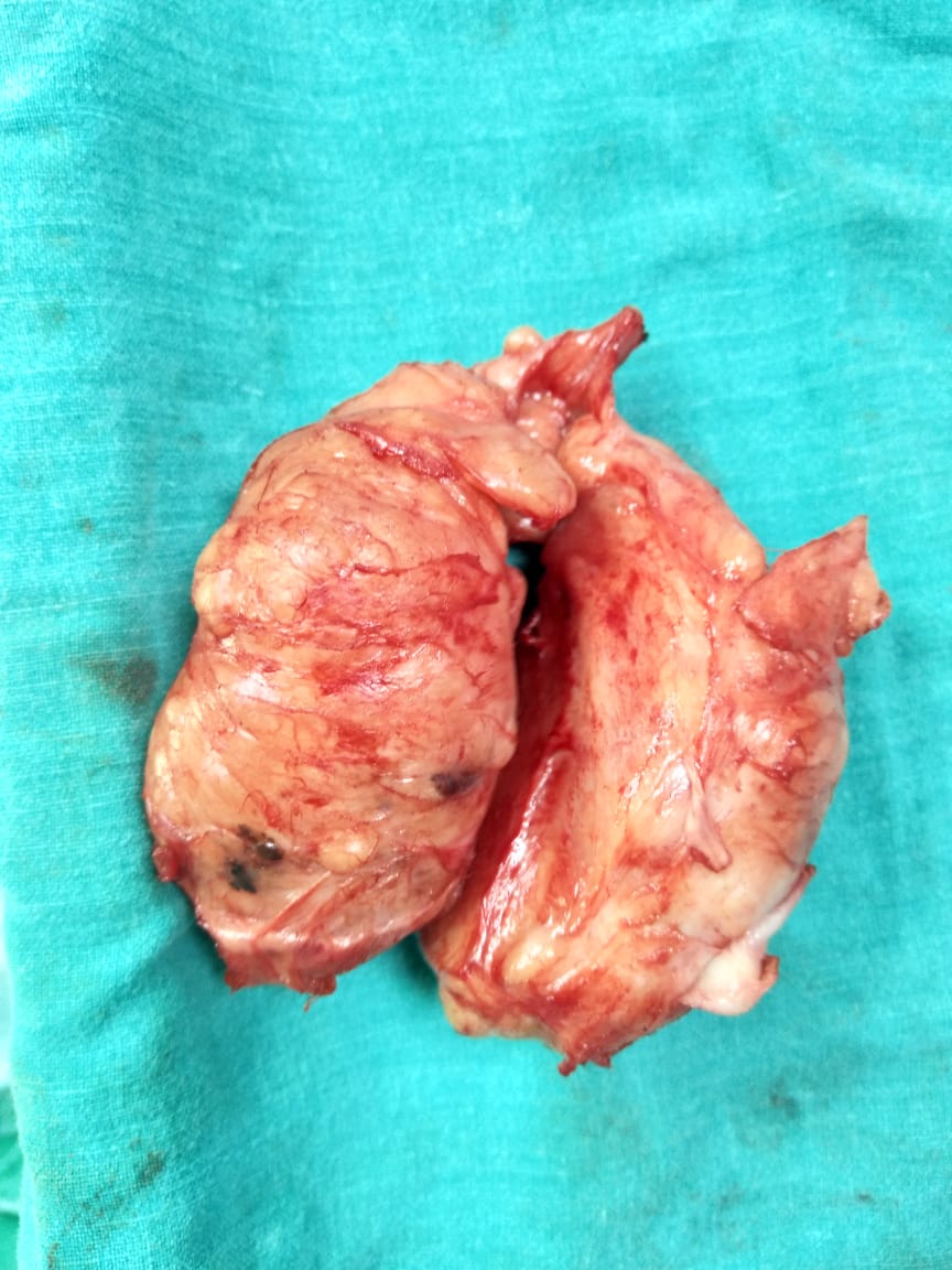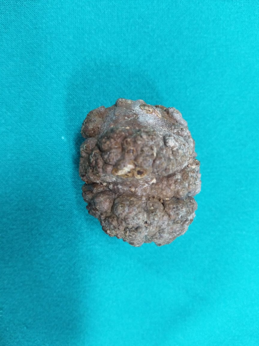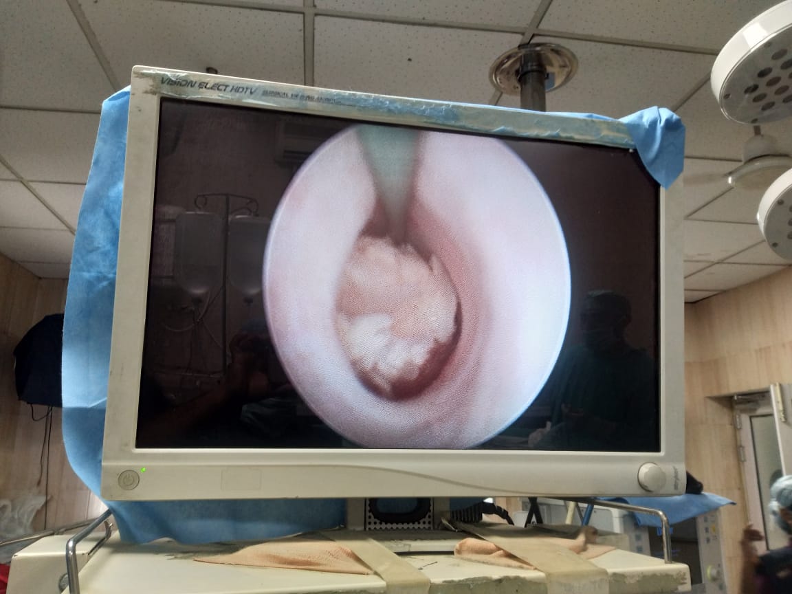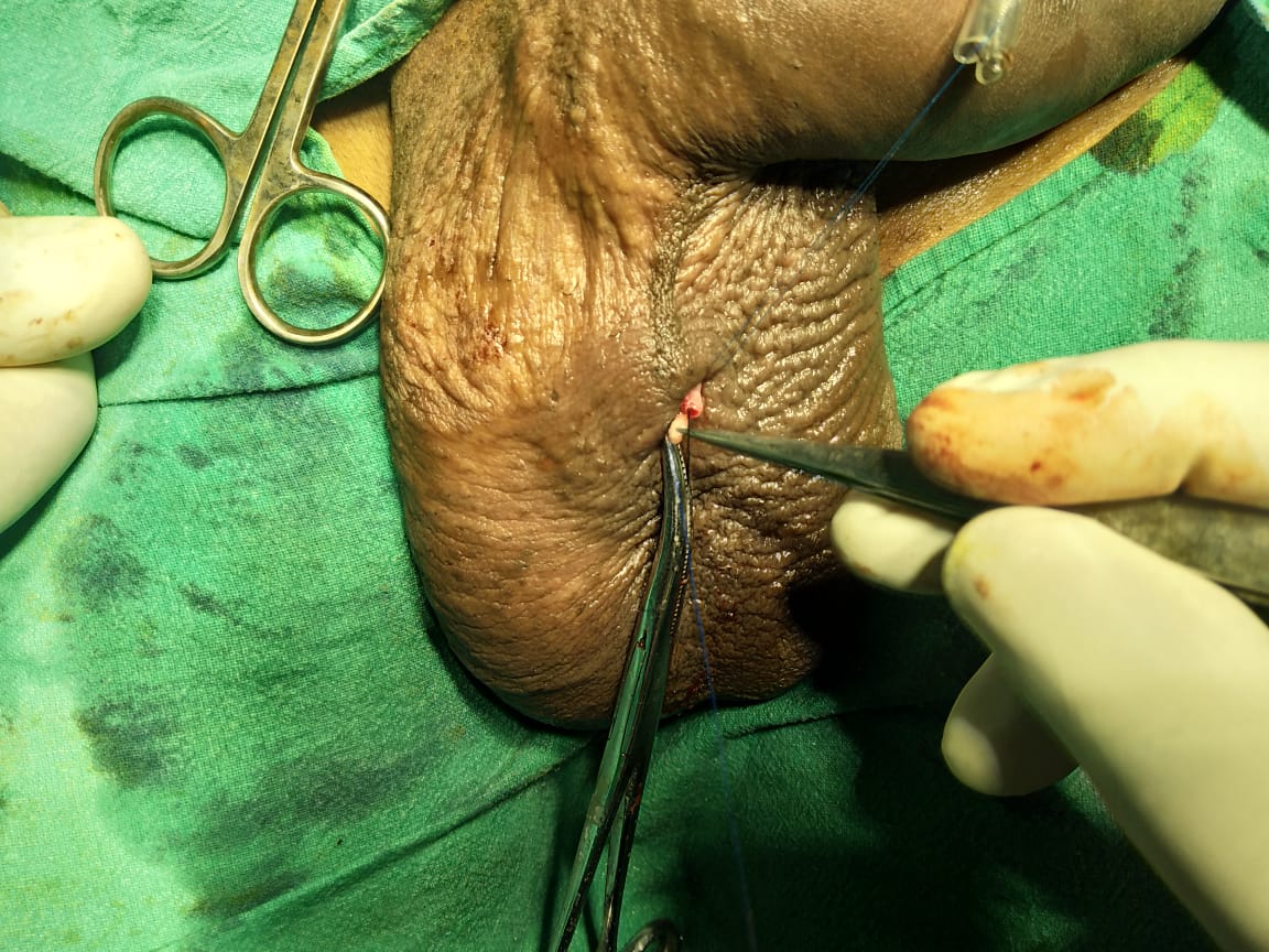 Open prostatectomy for huge prostate enlargement with urinary retention. Complete removal of prostate done with small skin incision